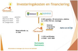 We hebben gekozen voor een deel financiering, omdat we daarmee twee belangrijke factoren afdekken. Ten eerste worden de prijzen voor certificaten lager (200 in plaats van 300 euro), dus kunnen ook bewoners mee gaan doen met een kleinere beurs. En, niet onbelangrijk: het rendement wordt beduidend beter. De gemeente Alphen aan den Rijn ondersteunt Zon op Alphen met een duurzaamheidslening van 180.000 euro tegen een rente van 2 procent.